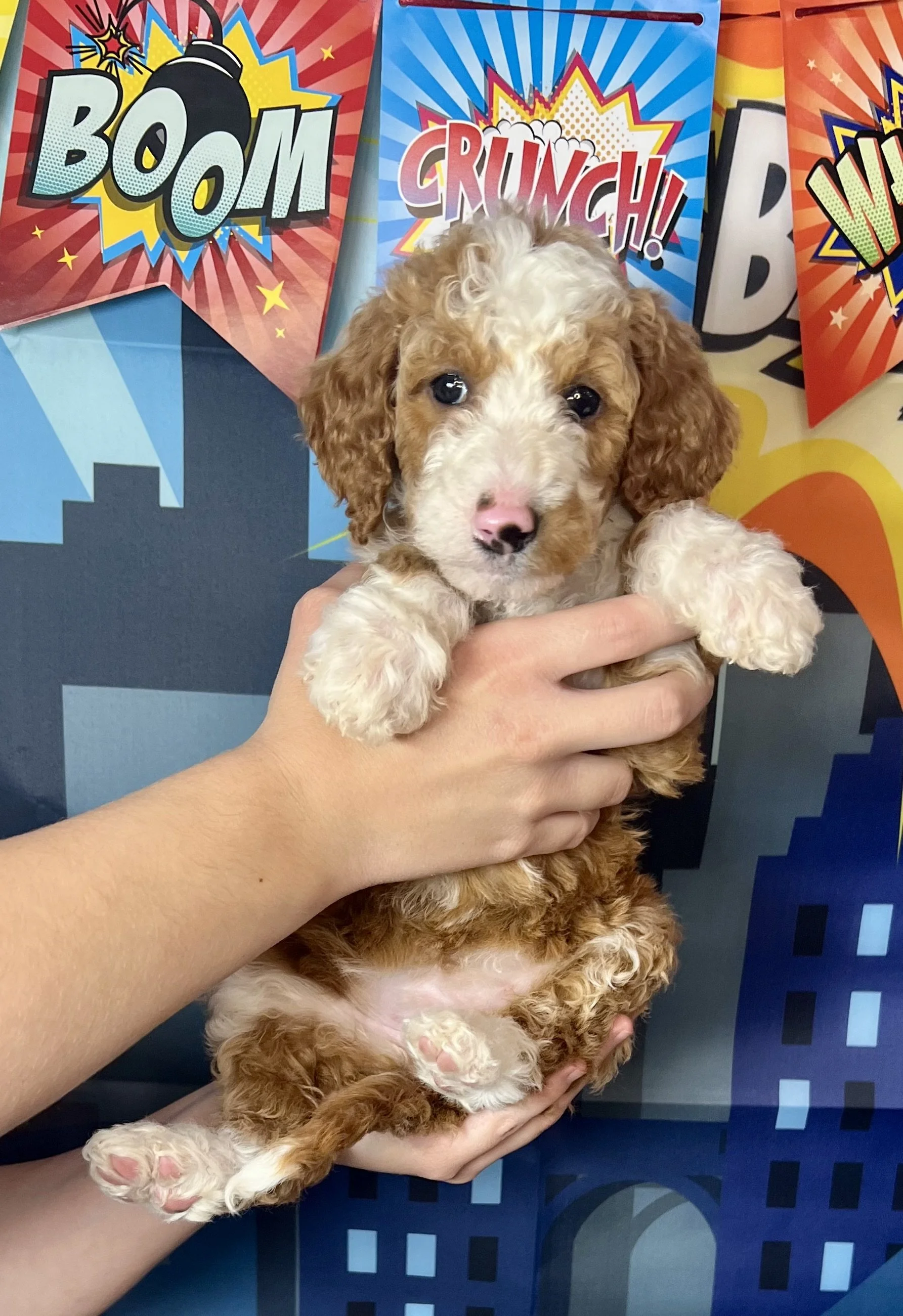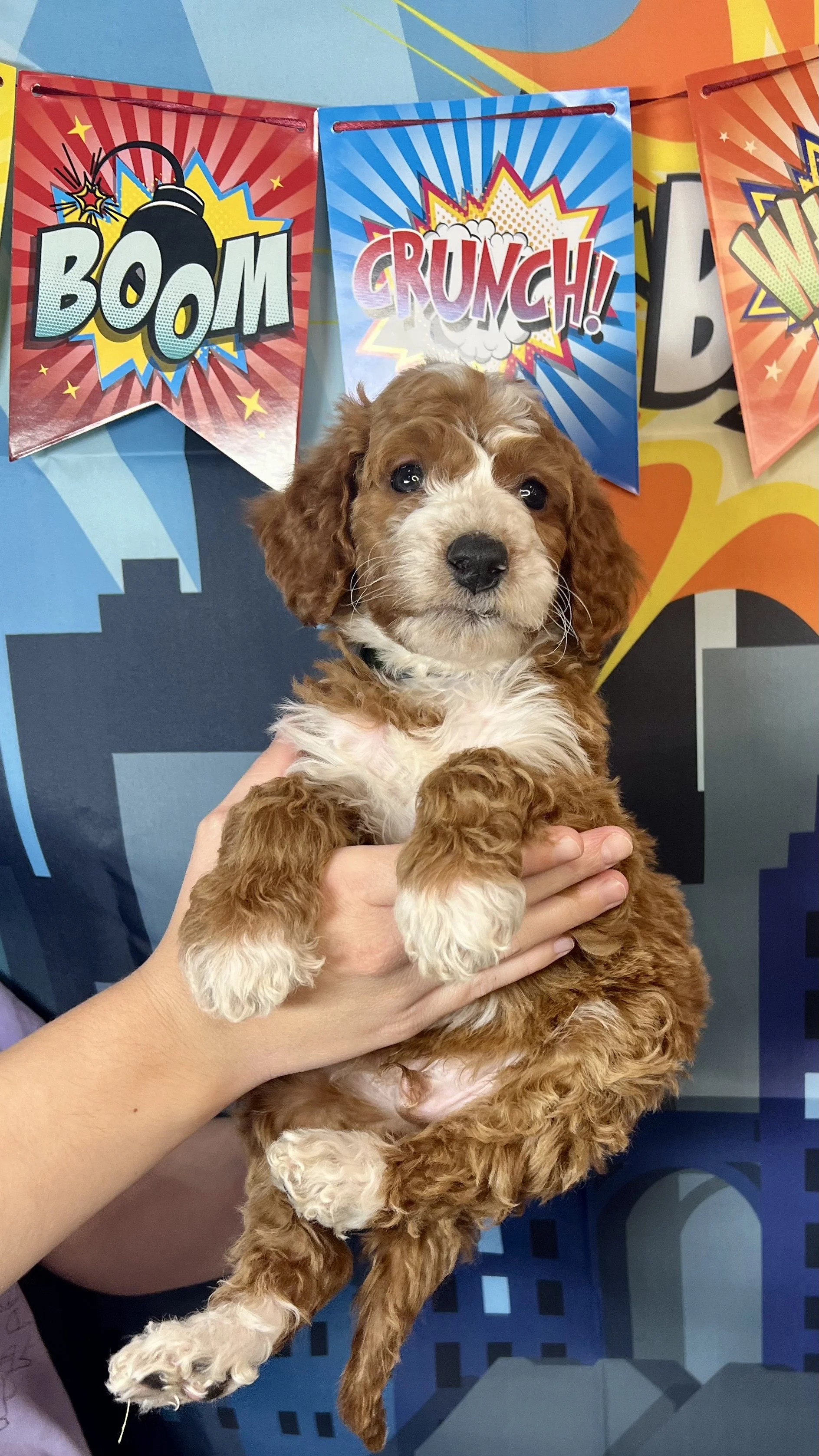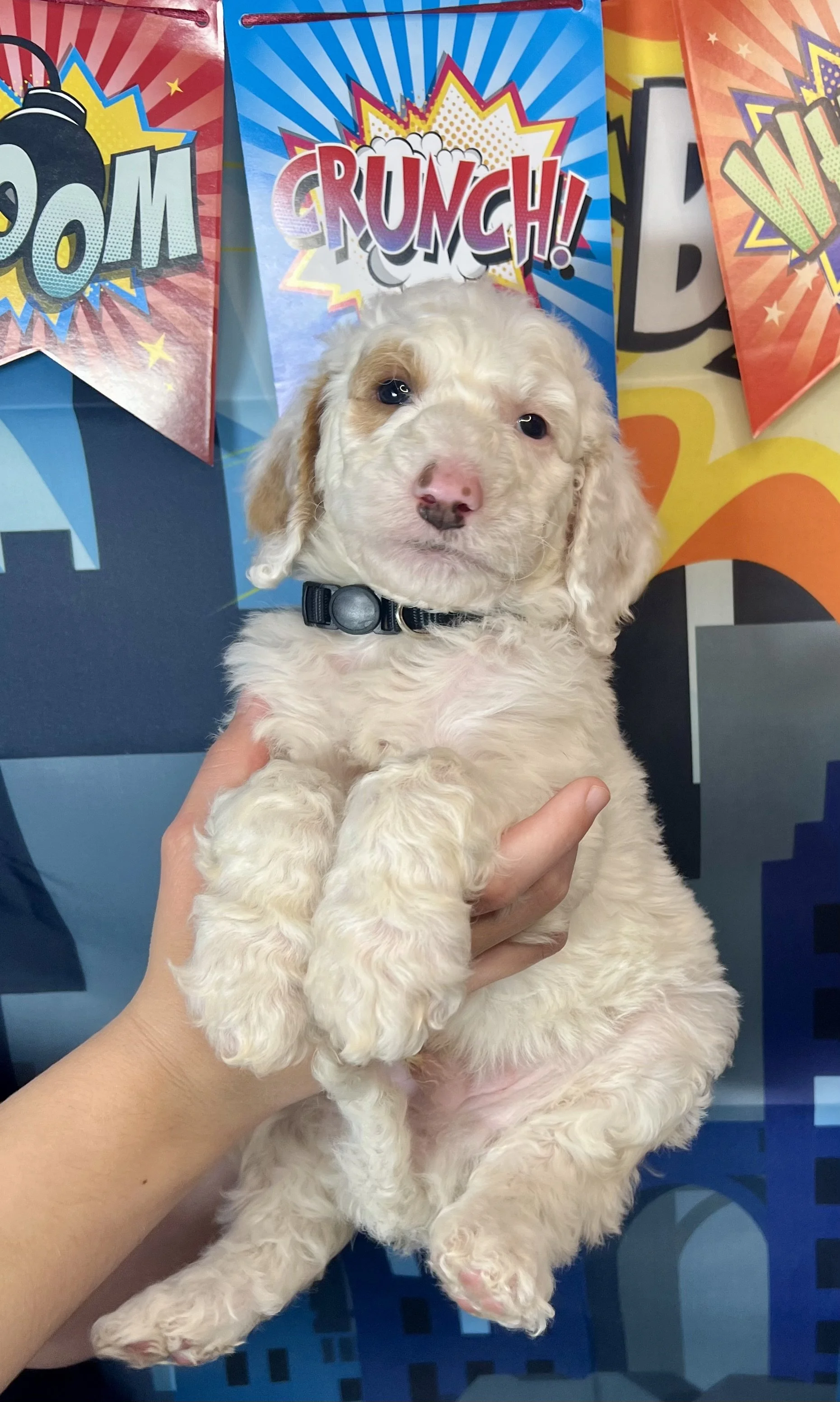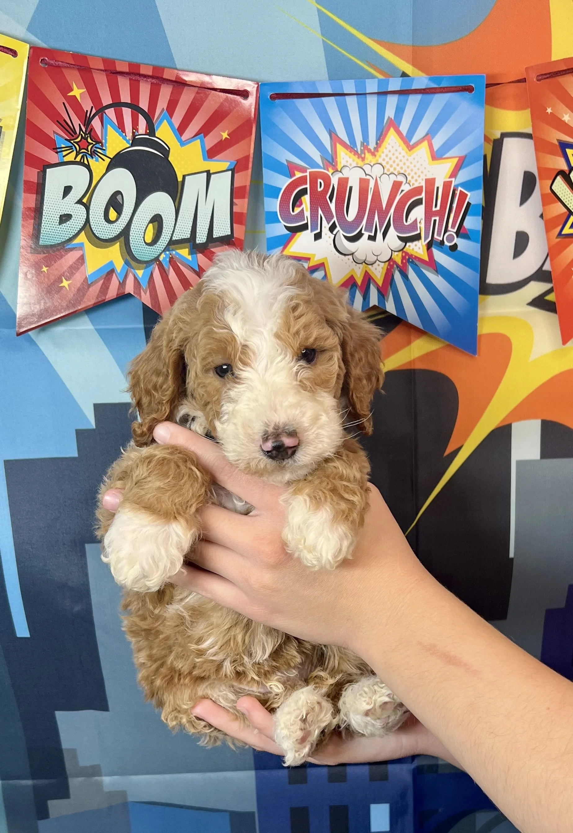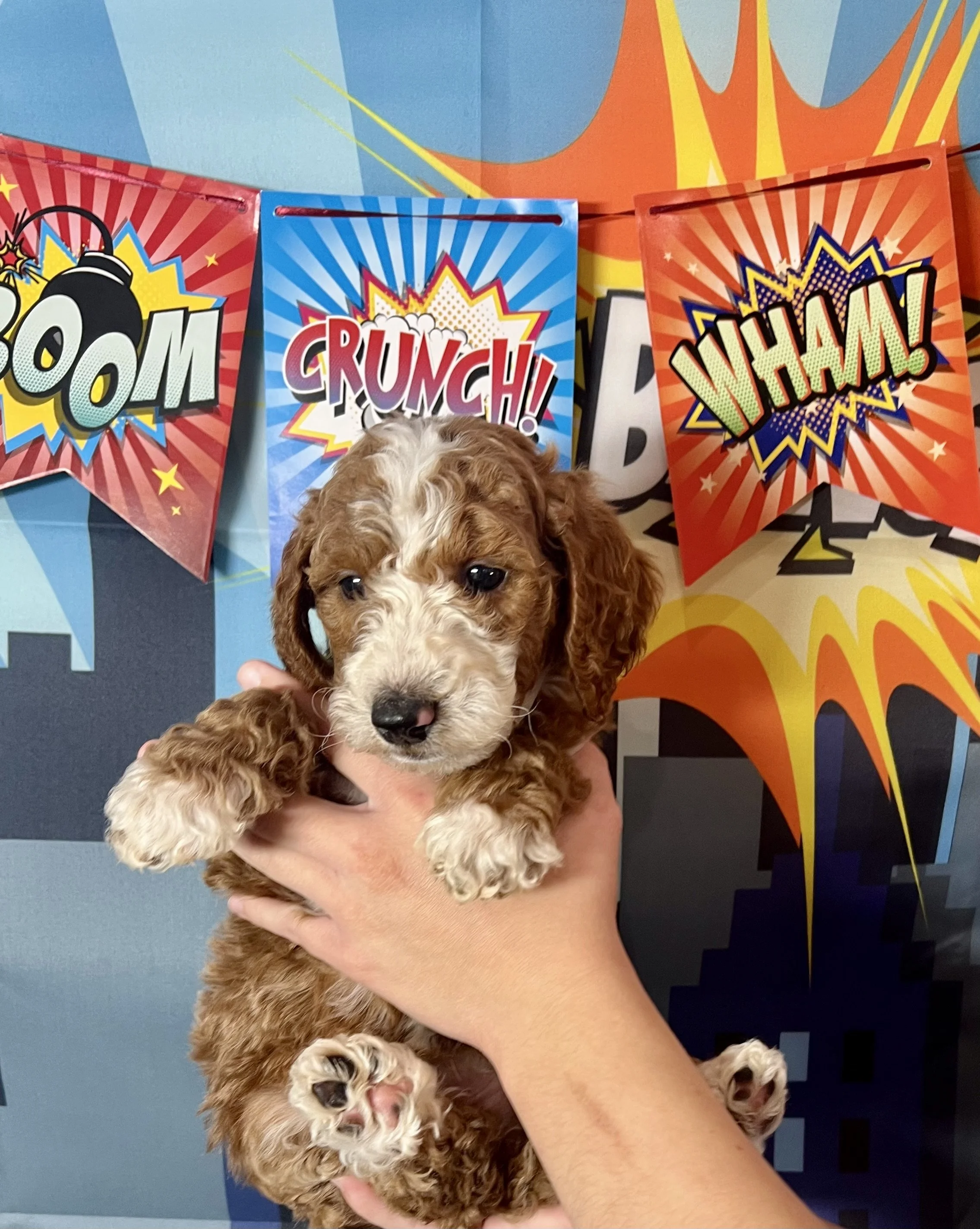 The MARVELous litter of Standard Goldendoodles have arrived and they were worth the wait. They are so cute! We have a bunch with Tuxedo coats, and pretty parti’s too. These little guys will be about 50 lb and will all have the proper furnishings that give doodles the fuzzy eyebrows and “doodle look”. Their “going home day” is set for Oct 18th. We still have 3 spots available for this litter as of 10/11/25.